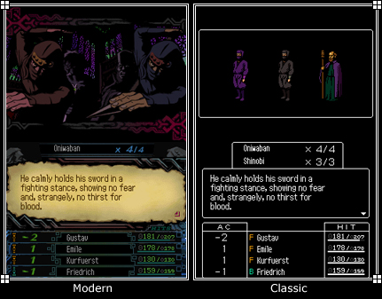 Some adventurers will choose to play using the “modern” interface, its bold, stylized textures and palettes delivering a fresh, up-to-date adventure. Others may opt for the “classic” mode, guaranteed to evoke overwhelming sensations of nostalgia as it perfectly recreates the style and simplicity of the fathers of the genre. Two different presentation modes, two different ways to experience The Dark Spire!